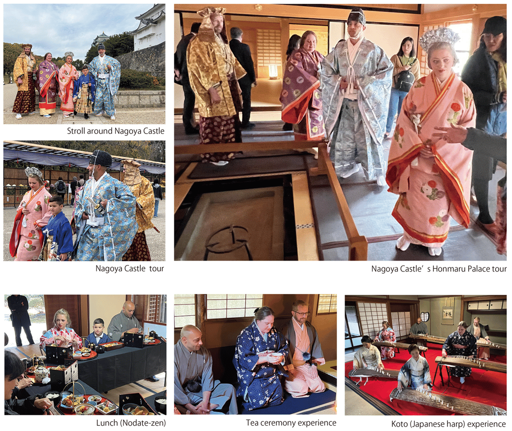 On day two, change into a period costume in a separate hotel room and depart for Nagoya Castle. You are sure to attract the attention of other tourists while strolling around Nagoya Castle in period costume, and visit Nagoya Castle’s Honmaru Palace. At Ofukai Maru change into kimono, and have a "Nodate-zen" lunch. After lunch, experience the Japanese culture of tea ceremony and koto. This is a tour brimming with cultural experiences.