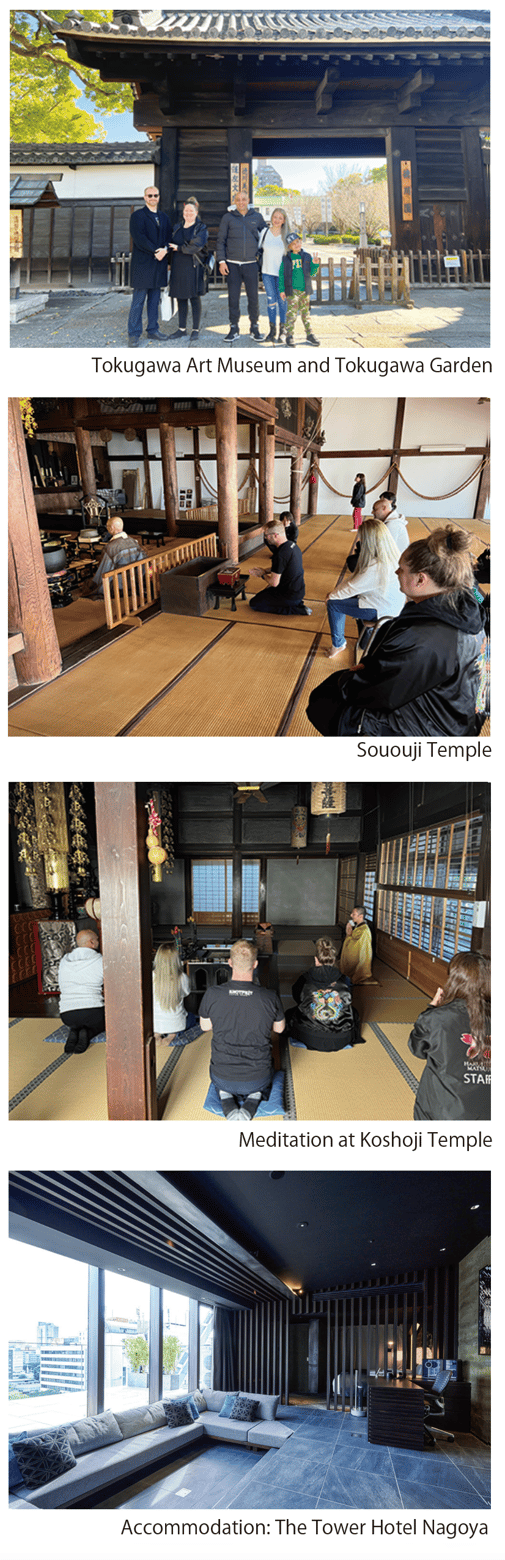 On the first day, visit the Tokugawa Art Museum and Tokugawa Garden. Afterwards, visit Sououji Temple where you will be guided on an explanatory tour of the temple and its grounds by the temple's chief priest. For lunch, enjoy exquisite Edomae sushi at the restaurant ‘Sushi Kanau’ in Shoin. Also, experience a special 'bell-ringing.' Then, after a guided tour of the temple grounds at Koshoji Temple by a monk, experience meditation at Chikusuitei. Stay overnight at The Tower Hotel Nagoya, the world's most uniquely located hotel - in a TV tower. Dinner will be served at the hotel's hidden away restaurant.